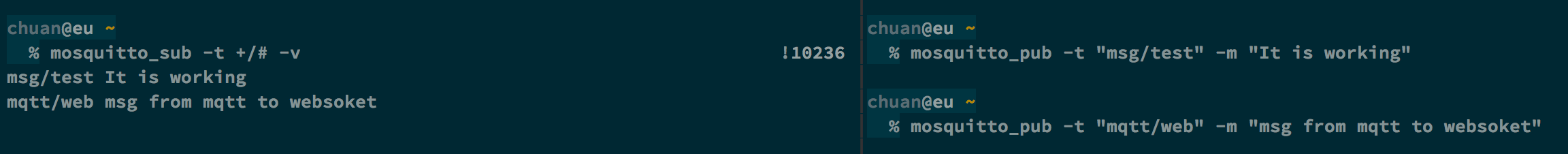 If we start to send some messages from command like, we will get the data coming via mqtt through mosquitto broker and then via websocket published to js client.
