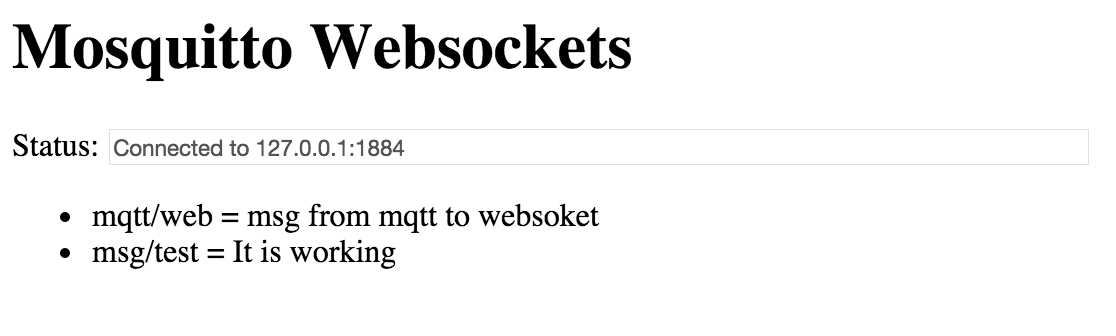 <html> <head> <title>Mosquitto Websockets</title> <script src="jquery.js" type="text/javascript"></script> <script src="mqttws31.js" type="text/javascript"></script> <script type="text/javascript"> var mqtt; var reconnectTimeout = 2000; var port = 1884; var host = "127.0.0.1" var topic = "+/#"