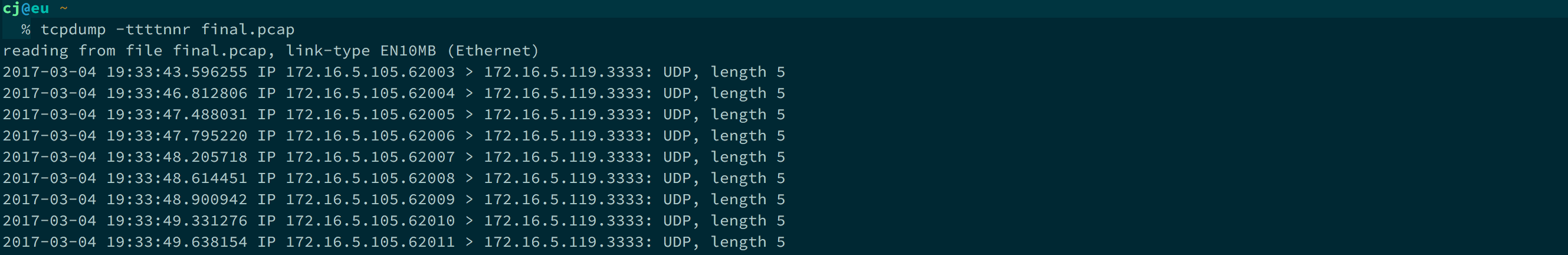 Let’s have more fun! Assuming we have captured some UDP packets using the command below: