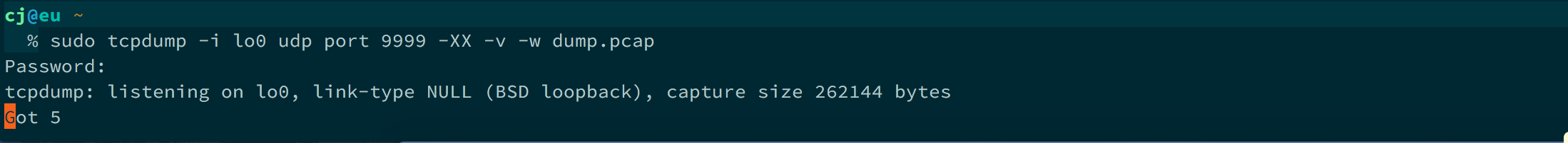 1 | sudo tcpdump -i lo0 port 9999 -XX -v |